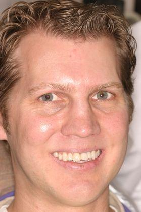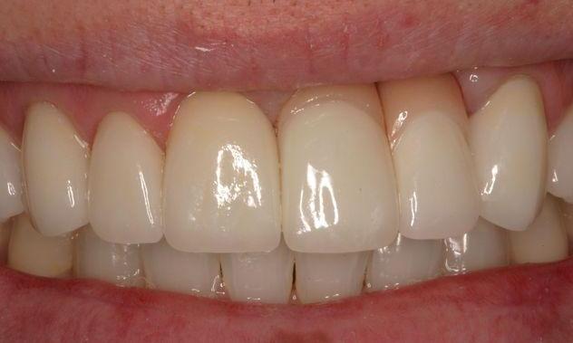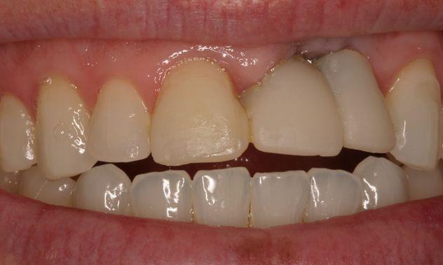 The patient had an accident and lost two front teeth and fractured four others. We improved his smile with implants and porcelain veneers.